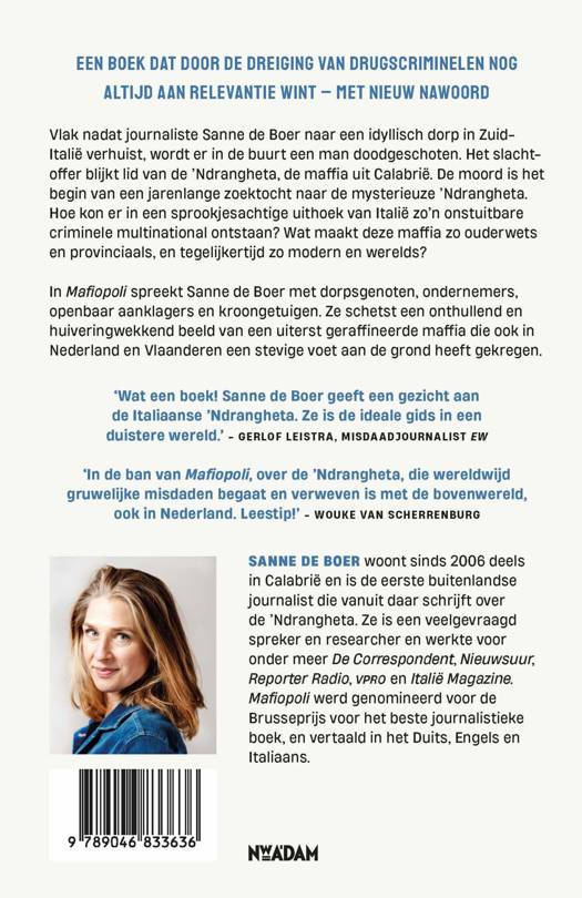 'Mafiopoli schetst een indringend portret van de grootste criminele multinational ter wereld.' — **** de Volkskrant 'Wat een boek! Sanne de Boer geeft een gezicht aan de Italiaanse 'Ndrangheta. Ze is de ideale gids in een duistere wereld.' — Gerlof Leistra, misdaadjournalist Elsevier 'In de ban van Mafiopoli, over de 'Ndrangheta, die wereldwijd gruwelijke misdaden begaat en verweven is met de bovenwereld, ook in Nederland. Leestip!' — Wouke van Scherrenburg 'Naast Gomorra van Roberto Saviano een van de beste boeken over de maffia op de markt.' — NBD Biblion 'De vele sprekende details [...] en het engagement van de auteur brengen de 'Ndrangheta tot leven.' — Frankfurter Allgemeine Zeitung 'Een fascinerend boek dat laat zien hoe de georganiseerde misdaad onze samenleving van onderaf in zijn greep krijgt en zich over de hele wereld verspreidt.' — Miles Johnson, onderzoeksjournalist Financial Times 'Dit verhaal is net zo spannend als een thriller of tv-serie, maar het is waargebeurd, en gebaseerd op feilloos onderzoek.' — Book Riot