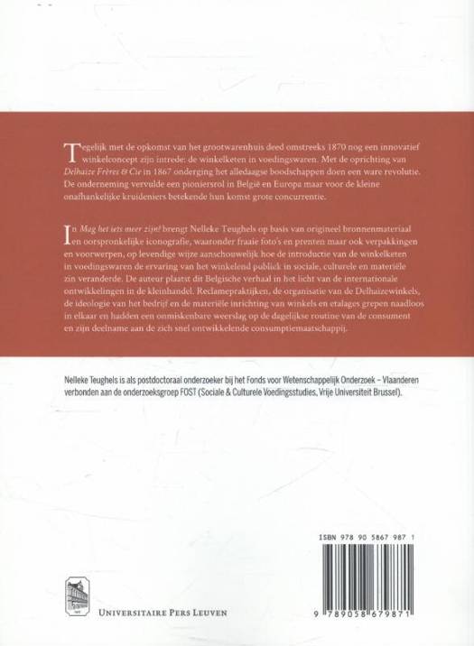 Van de kleine kruidenier om de hoek tot vernieuwende winkelketen. Tegelijk met de opkomst van het grootwarenhuis deed omstreeks 1870 nog een innovatief winkelconcept zijn intrede: de winkelketen in voedingswaren. Met de oprichting van ‘Delhaize Frères & Cie’ in 1867 onderging het alledaagse boodschappen doen een ware revolutie. De onderneming vervulde een pioniersrol in België en Europa maar voor de kleine onafhankelijke kruideniers betekende hun komst grote concurrentie. In ‘Mag het iets meer zijn?’ brengt Nelleke Teughels op basis van origineel bronnenmateriaal en oorspronkelijke iconografie, waaronder fraaie foto’s en prenten maar ook verpakkingen en voorwerpen, op levendige wijze aanschouwelijk hoe de introductie van de winkelketen in voedingswaren de ervaring van het winkelend publiek in sociale, culturele en materiële zin veranderde. De auteur plaatst dit Belgische verhaal in het licht van de internationale ontwikkelingen in de kleinhandel. Reclamepraktijken, de organisatie van de Delhaizewinkels, de ideologie van het bedrijf en de materiële inrichting van winkels en etalages grepen naadloos in elkaar en hadden een onmiskenbare weerslag op de dagelijkse routine van de consument en zijn deelname aan de zich snel ontwikkelende consumptiemaatschappij.