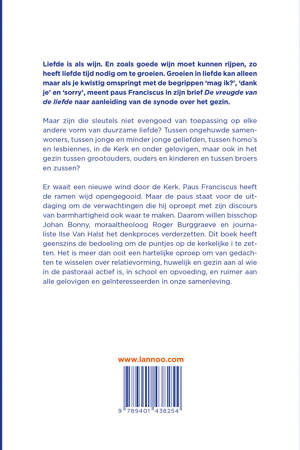 Een open dialoog over relaties, opvoeding en gezin vanuit christelijk perspectief Liefde is als wijn. En zoals goede wijn moet kunnen rijpen, zo heeft liefde tijd nodig om te groeien. Groeien in liefde kan alleen maar als je kwistig omspringt met de begrippen 'mag ik?', 'dank je' en 'sorry', meent paus Franciscus in zijn brief De vreugde van de liefde naar aanleiding van de synode over het gezin. Maar zijn die sleutels niet evengoed van toepassing op elke andere vorm van duurzame liefde? Tussen ongehuwde samenwoners, tussen jonge en minder jonge geliefden, tussen homo's en lesbiennes, in de Kerk en onder gelovigen, maar ook in het ge zin tussen grootouders, ouders en kinderen en tussen broers en zussen? Er waait een nieuwe wind door de Kerk. Paus Franciscus heeft de ramen wijd opengegooid. Maar de paus staat voor de uitdaging om de verwachtingen die hij oproept met zijn discours van barm hartigheid ook waar te maken. Daarom willen bisschop Johan Bonny, moraaltheoloog Roger Burggraeve en journaliste Ilse Van Halst het denkproces verderzetten. Dit boek heeft geenszins de bedoeling om de puntjes op de kerkelijke i te zetten. Het is meer dan ooit een hartelijke oproep om van gedachten te wisselen over relatievorming, huwelijk en gezin aan al wie in de pastoraal actief is, in school en opvoeding, en ruimer aan alle gelovigen en geïnteresseerden in onze samenleving.