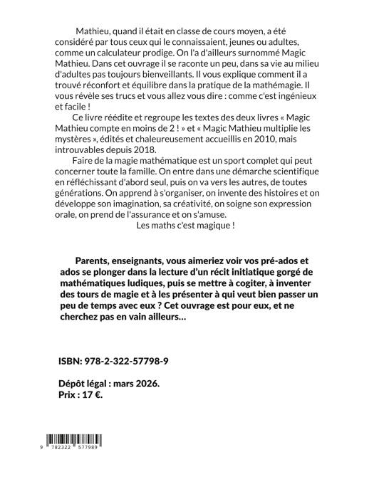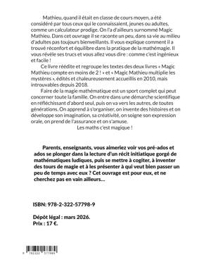 Mathieu, quand il était en classe de cours moyen, a été considéré par tous ceux qui le connaissaient, jeunes ou adultes, comme un calculateur prodige. On l'a d'ailleurs surnommé Magic Mathieu. Dans cet ouvrage il se raconte un peu, dans sa vie au milieu d'adultes pas toujours bienveillants. Il vous explique comment il a trouvé réconfort et équilibre dans la pratique de la mathémagie. Il vous révèle ses trucs et vous allez vous dire : comme c'est ingénieux et facile ! Ce livre réédite et regroupe les textes des deux livres « Magic Mathieu compte en moins de 2 ! » et « Magic Mathieu multiplie les mystères », édités et chaleureusement accueillis en 2010, mais introuvables depuis 2018. Faire de la magie mathématique est un sport complet qui peut concerner toute la famille. On entre dans une démarche scientifique en réfléchissant d'abord seul, puis on va vers les autres, de toutes générations. On apprend à s'organiser, on invente des histoires et on développe son imagination, sa créativité, on soigne son expression orale, on prend de l'assurance et on s'amuse. Les maths c'est magique ! Parents, enseignants, vous aimeriez voir vos ados et pré-ados se plonger dans la lecture d'un récit initiatique gorgé de mathématiques ludiques ? Ne cherchez pas en vain ailleurs, cet ouvrage est pour vous...