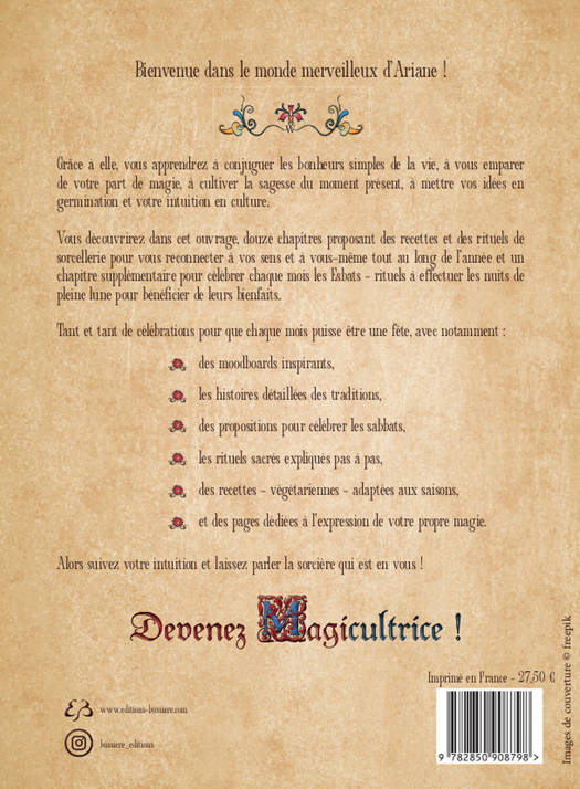 Ce livre a été écrit comme un grimoire, un objet de transmission de diverses recettes, activités à pratiquer en famille, rituels à célébrer seul ou à plusieurs, afin de se reconnecter à la magie de la vie, de la nature et du quotidien. Une ode à la douceur et à la créativité, afin de célébrer la vie tout au long de l’année selon les envies, les besoins et les possibilités. Vous retrouverez dans cet ouvrage des recettes et des rituels de sorcellerie pour se reconnecter à ses sens et à soi avec des moodboards inspirants, l'histoire détaillée des différentes traditions, des propositions pour célébrer chaque sabbat, des rituels sacrés expliqués pas à pas, des recettes adaptées à chaque saison (végétariennes) et des espaces pour laisser toute votre magie s'exprimer. Avec cela, vous retrouverez des annexes de yoga et de magnifiques illustrations. Alors, suivez votre Intuition, et laissez parler la sorcière qui est en vous !