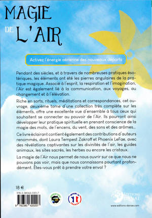 Activez l’énergie aérienne des nouveaux départs Pendant des siècles, et à travers de nombreuses pratiques ésotériques, les éléments ont été les pierres angulaires de la pratique magique. Associé à l’esprit, la respiration et l’imagination, l’Air est également lié à la communication, aux voyages, au changement et à l’élévation. Riche en sorts, rituels, méditations et correspondances, cet ouvrage, deuxième tome d’une collection très complète sur les éléments, offre une excellente vue d’ensemble à tous ceux qui souhaitent se connecter au pouvoir de l’Air. Ils pourront ainsi développer leur pratique spirituelle en prenant conscience de la magie des mots, de l’encens, du vent, des sons et des arômes… Ce livre éclairant contient également des contributions d’auteurs renommés, dont Laura Tempest Zakroff et Phoenix LeFae, avec des révélations captivantes sur les divinités de l’air, les guides animaux, les sites sacrés, les herbes ou encore les cristaux. La magie de l’Air nous permet de nous ouvrir sur ce que nous ne pouvons pas voir, mais que nous connaissons pourtant profondément. Êtes-vous prêt à prendre votre envol ?