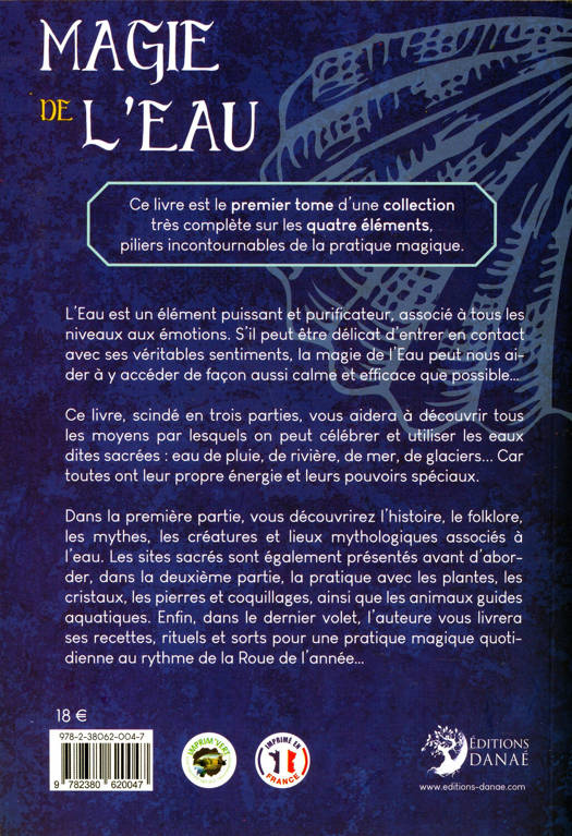 Ce livre est le premier tome d'une collection très complète sur les quatre éléments, piliers incontournables de la pratique magique. L'Eau est un élément puissant et purificateur, associé à tous les niveaux aux émotions. S'il peut être délicat d'entrer en contact avec ses véritables sentiments, la magie de l'Eau peut nous aider à y accéder de façon aussi calme et efficace que possible... Ce livre, scindé en trois parties, vous aidera à découvrir tous les moyens par lesquels on peut célébrer et utiliser les eaux dites sacrées : eau de pluie, de rivière, de mer, de glaciers... Car toutes ont leur propre énergie et leurs pouvoirs spéciaux. Dans la première partie, vous découvrirez l'histoire, le folklore, les mythes, les créatures et lieux mythologiques associés à l'eau. Les sites sacrés sont également présentés avant d'aborder, dans la deuxième partie, la pratique avec les plantes, les cristaux, les pierres et coquillages, ainsi que les animaux guides aquatiques. Enfin, dans le dernier volet, l'auteure vous livrera ses recettes, rituels et sorts pour une pratique magique quotidienne au rythme de la Roue de l'année...