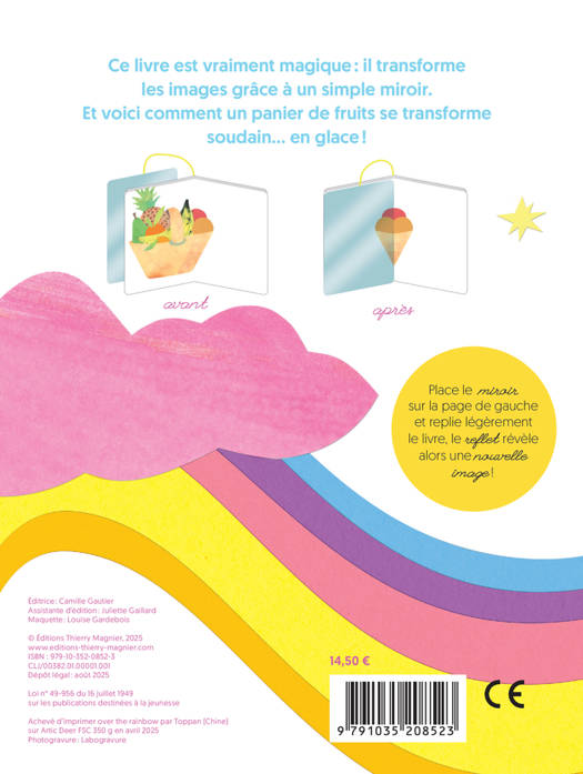 Ce livre est vraiment magique : il transforme les images grâce à un simple miroir. Et voici comment un panier de fruits se transforme soudain... en glace !