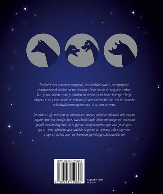 Een hert met een prachtig gewei, een sierlijke zwaan, een grappige chimpansee of een heuse neushoorn… Deze dieren en nog vele andere kun je met alleen maar je handen en een lamp tot leven brengen! Zet je vingers in de juiste positie en verbaas je vrienden en familie met de mooiste schaduwfiguren op de muur of op een scherm. De auteurs zijn ervaren schaduwkunstenaars die internationaal veel succes oogsten met hun magische shows. In dit boek delen ze hun geheimen zodat je zelf aan de slag kunt. Je krijgt opwarmingsoefeningen voor je vingers, tips om een optreden voor publiek te geven en uiteraard de stap-voor-stapinstructies voor een heleboel geweldige schaduwdieren!