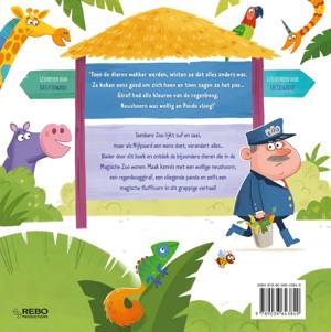 Toen de dieren wakker werden, wisten ze dat alles anders was. Ze keken eens goed om zich heen en toen zagen ze het pas… Giraf had alle kleuren van de regenboog, Neushoorn was wollig en Panda vloog!