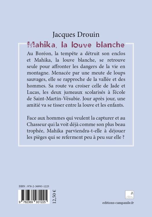 Au Boréon, la tempête a détruit son enclos et Mahika, la louve blanche, se retrouve seule pour affronter les dangers de la vie en montagne. Menacée par une meute de loups sauvages, elle se rapproche de la vallée et des hommes. Sa route va croiser celle de Jade et Lucas, les deux jumeaux scolarisés à l’école de Saint-Martin-Vésubie. Jour après jour, une amitié va se tisser entre la louve et les enfants. Face aux hommes qui veulent la capturer et au Chasseur qui la voit déjà comme son plus beau trophée, Mahika parviendra-t-elle à déjouer les pièges qui se referment peu à peu sur elle ?