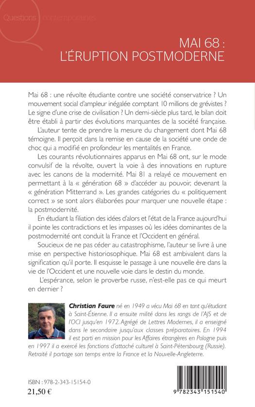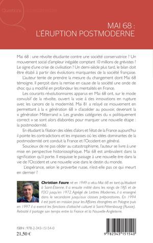 Mai 68 : une révolte étudiante contre une société conservatrice ? Les courants révolutionnaires de mai 68 ont ouvert la voie à des innovations en rupture avec les canons de la modernité, permettant à la « génération 68 » d’accéder au pouvoir et de créer une nouvelle étape : la postmodernité. Étudiant les idées d’alors et l’état de la France aujourd’hui, l’auteur pointe les contradictions et les impasses où la postmodernité a mené la France et l’Occident.