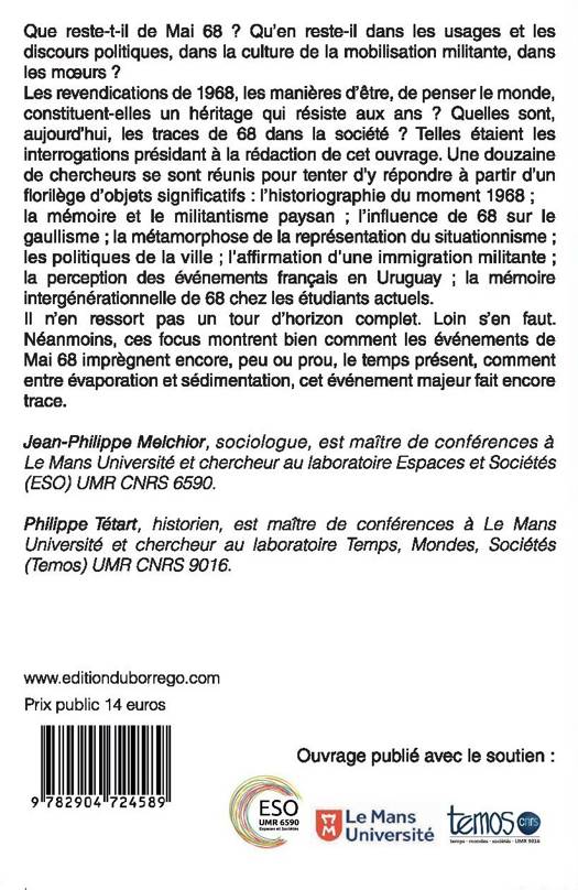 Que reste-t-il de Mai 68 ? Qu'en reste-il dans les usages et les discours politiques, dans la culture de la mobilisation militante, dans les moeurs ? Les revendications de 1968, les manières d'être, de penser le monde, constituent-elles un héritage qui résiste aux ans ? Quelles sont aujourd'hui les traces de 68 dans la société ? Telles étaient les interrogations présidant à la rédaction de cet ouvrage. Une douzaine de chercheurs se sont réunis pour tenter d'y répondre à partir d'un florilège d'objets significatifs : l'historiographie du moment 1968 ; la mémoire et le militantisme paysan ; l'influence de 68 sur le gaullisme ; la métamorphose de la représentation du situationnisme ; les politiques de la ville ; l'affirmation d'une immigration militante ; la perception des événements français en Uruguay ; la mémoire intergénérationnelle de 68 chez les étudiants actuels. Il n'en ressort pas un tour d'horizon complet. Loin s'en faut. Néanmoins, ces focus montrent bien comment les événements de Mai 68 imprègnent encore, peu ou prou, le temps présent, comment entre évaporation et sédimentation, cet événement majeur fait encore trace.