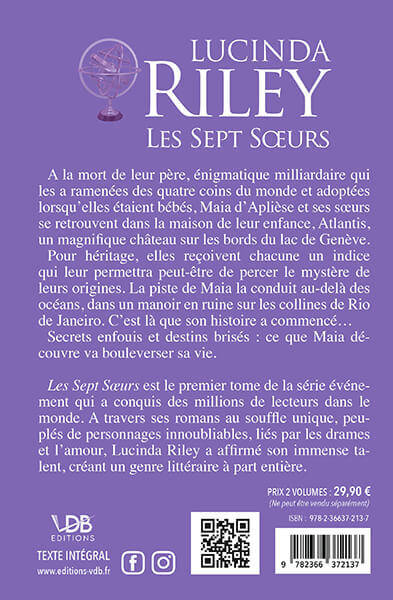 Les Sept Sœurs est le premier tome de la série événement qui a conquis des millions de lecteurs dans le monde. A travers ses romans au souffle unique, peuplés de personnages inoubliables, liés par les drames et l’amour, Lucinda Riley a affirmé son immense ta- lent, créant un genre littéraire à part entière.