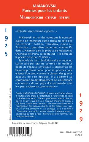 Maïakovski, célèbre poète de la littérature russe de l'époque soviétique est moins connu pour ses poèmes pour enfants, "Le cheval-feu","Quel métier choisir ?","Chanson-éclair" ou "Histoire de Vlas, vaurien et paresseux". Cet ouvrage en bilingue russe-français est l'occasion de découvrir sa contribution au développement de la littérature de jeunesse de son pays alors en marche vers le "pays radieux du communisme".