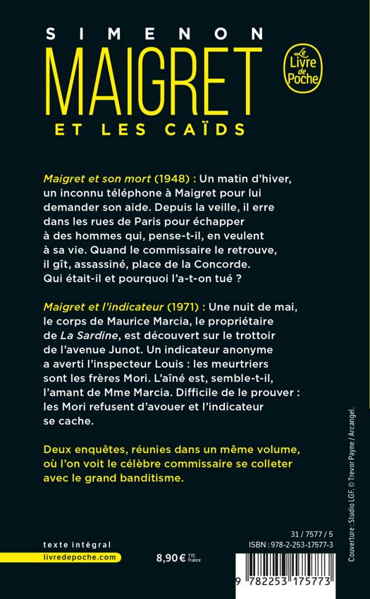 Maigret et l’indicateur (1971) : Une nuit de mai, le corps de Maurice Marcia, le propriétaire de La Sardine, est découvert sur le trottoir de l’avenue Junot. Un indicateur anonyme a averti l’inspecteur Louis : les meurtriers sont les frères Mori. L’aîné est, semble-t-il, l’amant de Mme Marcia. Difficile de le prouver : les Mori refusent d’avouer et l’indicateur se cache.