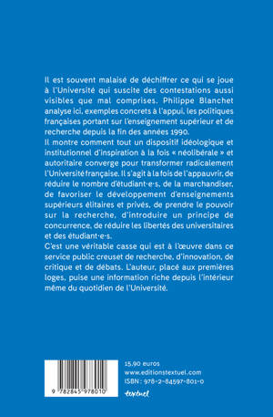 Philippe Blanchet dénonce ici la façon dont les politiques néo-libérales cassent l'université pour se l'approprier et prendre le pouvoir dans ce traditionnel bastion de contestation. Il livre une analyse claire et percutante des politiques françaises d'enseignement supérieur et de recherche depuis la fin des années 1990.