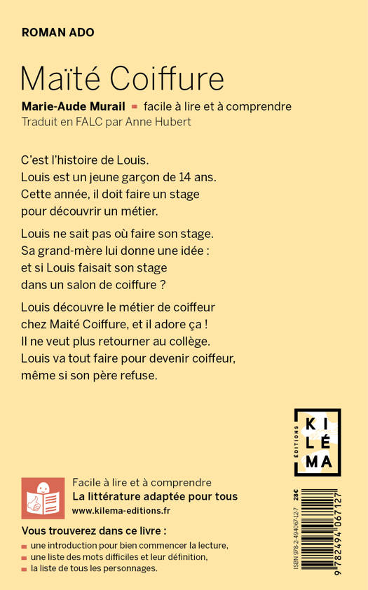 UN LIVRE FACILE À LIRE ET À COMPRENDRE C'est l'histoire de Louis. Louis est un jeune garçon de 14 ans. Cette année, il doit faire un stage pour découvrir un métier. Louis ne sait pas où faire son stage. Sa grand-mère lui donne une idée : et si Louis faisait son stage dans un salon de coiffure ? Louis découvre le métier de coiffeur chez Maité Coiffure, et il adore ça ! Il ne veut plus retourner au collège. Louis va tout faire pour devenir coiffeur, même si son père refuse. **** Découvrez ce classique de Marie-Aude Murail, accessible à toutes et tous !