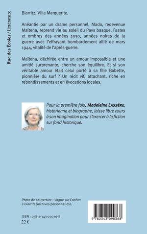 Anéantie par un drame personnel, Mado, redevenue Maïtena, reprend vie au soleil du Pays basque. Fastes et ombres des années 1930, années noires de la guerre avec l’effrayant bombardement allié de mars 1944, vitalité de l’après-guerre. Maïtena, déchirée, entre un amour impossible et une amitié surprenante, cherche son équilibre. Et si son véritable amour était celui porté à sa fille Babette, pionnière du surf ?