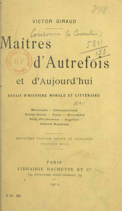 Essais d'histoire morale et littéraire : Montaigne, Châteaubriand, Sainte-Beuve, Taine, Brunetière, Sully-Prudhomme, Angellier, Hanotaux