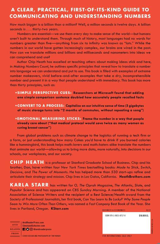 Author Chip Heath has excelled at teaching others about making ideas stick and here, in Making Numbers Count, he outlines specific principles that reveal how to translate a number into our brain’s language. This book is filled with examples of extreme number makeovers, vivid before-and-after examples that take a dry number and present it in a way that people click in and say “Wow, now I get it!”