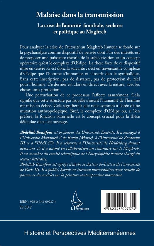 Les évolutions des pays maghrébins ont affecté les institutions fondamentales pour toute communauté humaine : la famille, l'éducation, la société. L'ouvrage décrit et tente d'expliquer certains phénomènes chez la jeunesse maghrébine comme la perte des repères, le consumérisme, la conversion au radicalisme religieux, le voile dit islamique, etc. Il cerne ainsi une crise des valeurs et des institutions et souligne qu'elle est due à un malaise dans la transmission entre générations. En effet, les nouvelles générations seraient des fils et filles sans pères. L'ouvrage propose, en conclusion, une réflexion sur le père à venir.