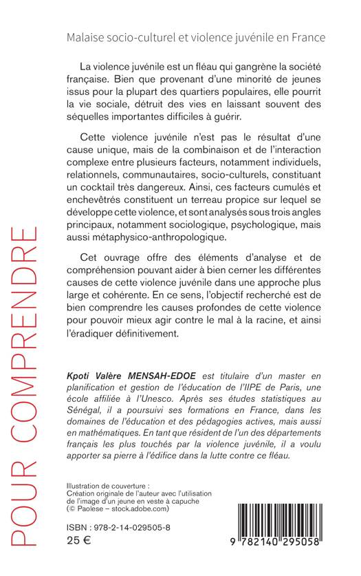 La violence juvénile est un fléau qui gangrène la société française. Bien que provenant d'une minorité de jeunes issus pour la plupart des quartiers populaires, elle pourrit la vie sociale, détruit des vies en laissant souvent des séquelles importantes difficiles à guérir. Cette violence juvénile n'est pas le résultat d'une cause unique, mais de la combinaison et de l'interaction complexe entre plusieurs facteurs, notamment individuels, relationnels, communautaires, socio-culturels, constituant un cocktail très dangereux. Ainsi, ces facteurs cumulés et enchevêtrés constituent un terreau propice sur lequel se développe cette violence, et sont analysés sous trois angles principaux, notamment sociologique, psychologique, mais aussi métaphysico-anthropologique. Cet ouvrage offre des éléments d'analyse et de compréhension pouvant aider à bien cerner les différentes causes de cette violence juvénile dans une approche plus large et cohérente. En ce sens, l'objectif recherché est de bien comprendre les causes profondes de cette violence pour pouvoir mieux agir contre le mal à la racine, et ainsi l'éradiquer définitivement.