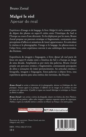 Expérience d’image et de langage, le livre Malgré le réel a comme point de départ des photos en super-8 créées entre l’Amérique du Sud et l’Europe au cours d’une décennie. En les déployant par les mots, Bruno Zorzal propose un parcours erratique et fragmentaire, contrastant entre perceptions d’affects et sensations de (non) appartenance. En articulant le cinéma et la photographie, l’image et le langage, les photos-mots et l’objet livre, cette expérience renvoie à une esthétique des traversées, des frictions.