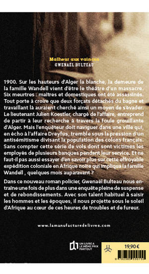 1900. Sur les hauteurs d’Alger la blanche, la demeure de la famille Wandell vient d’être le théâtre d’un massacre. Six meurtres : maîtres et domestiques ont été assassinés. Tout porte à croire que deux forçats détachés du bagne et travaillant là auraient cherché ainsi un moyen de s’évader. Le lieutenant Julien Koestler, chargé de l’affaire, entreprend de partir à leur recherche à travers la foule grouillante d’Alger. Mais l’enquêteur doit naviguer dans une ville qui, en écho à l’affaire Dreyfus, tremble sous la pression d’un antisémitisme divisant la population des colons français. Sans compter cette série de vols dont sont victimes les employés de plusieurs banques pendant leur service. Et ne faut-il pas aussi essayer d’en savoir plus sur cette effroyable expédition coloniale en Afrique Noire qui impliqua la famille Wandell, quelques mois auparavant…