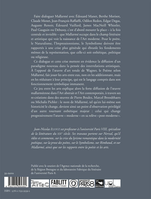 Faire dialoguer Mallarmé avec Édouard Manet, Berthe Morisot, Claude Monet, Jean-François Raffaëlli, Odilon Redon, Edgar Degas, Auguste Renoir, Édouard Vuillard, James MacNeill Whistler, Paul Gauguin ou Debussy, c’est d’abord mesurer la place – à la fois centrale et invisible – que Mallarmé occupe dans le champ littéraire et artistique qui voit la naissance de l’Art moderne. Pour le poète, le Naturalisme, l’Impressionnisme, le Symbolisme doivent être rapportés à une crise plus générale qui ébranle les fondements mêmes de la représentation, que celle-ci soit esthétique, politique ou religieuse.