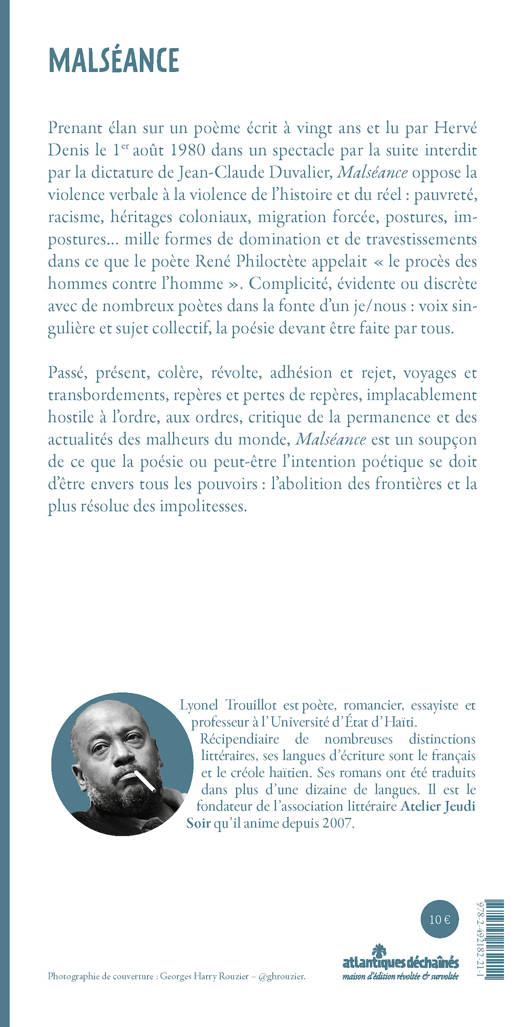 Prenant élan sur un poème écrit à vingt ans et lu par Hervé Denis le 1er août 1980 dans un spectacle par la suite interdit par la dictature de Jean-Claude Duvalier, Malséance oppose la violence verbale à la violence de l’histoire et du réel : pauvreté, racisme, héritages coloniaux, migration forcée, postures, impostures... mille formes de domination et de travestissements dans ce que le poète René Philoctète appelait « le procès des hommes contre l’homme ». Complicité, évidente ou discrète avec de nombreux poètes dans la fonte d’un je/nous : voix singulière et sujet collectif, la poésie devant être faite par tous. Passé, présent, colère, révolte, adhésion et rejet, voyages et transbordements, repères et pertes de repères, implacablement hostile à l’ordre, aux ordres, critique de la permanence et des actualités des malheurs du monde, Malséance est un soupçon de ce que la poésie ou peut-être l’intention poétique se doit d’être envers tous les pouvoirs : l’abolition des frontières et la plus résolue des impolitesses.