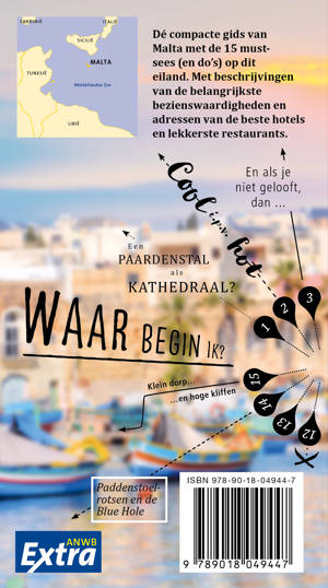 Beleef Malta met de compleet vernieuwde reisgids ANWB Extra Malta! Malta heeft prachtige stranden zoals Golden Bay en Ramla Bay op Gozo. De hoofdstad Valetta werd gekozen tot culturele stad van het jaar. Deze combinatie maakt Malta de perfecte bestemming voor een leuke zonvakantie.