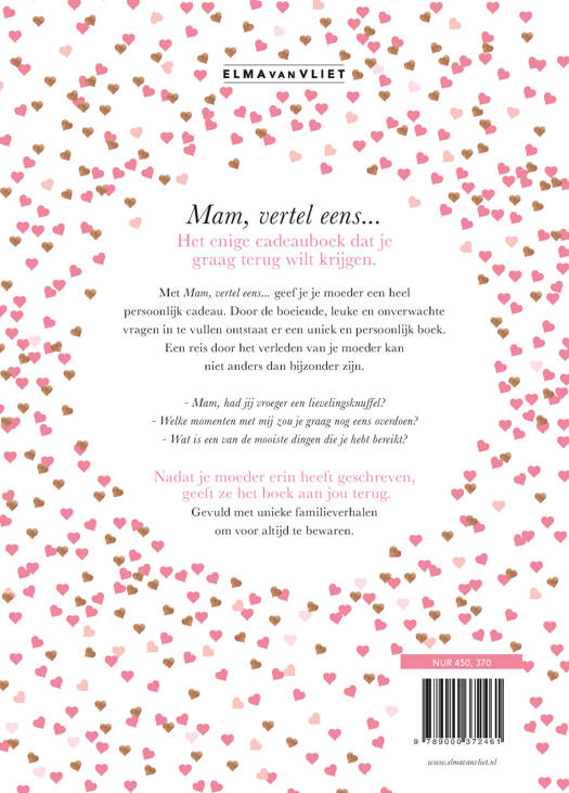 Met Mam, vertel eens geef je je moeder een ultiem invulboek cadeau: je geeft aan dat je alles wilt weten over haar herinneringen, dromen en wensen. Door het invullen van de leuke en onverwachte vragen over onderwerpen zoals haar kindertijd, verliefd zijn, moeder worden en de bijzondere band tussen moeder en kind, schrijft je moeder stap voor stap haar levensverhaal. Of maak het nog specialer door het boek samen in te vullen en in gesprek te gaan. Zo ontstaat er een uniek en persoonlijk boek van jullie samen. Als je moeder het boek heeft ingevuld, geeft ze het weer terug aan jou.