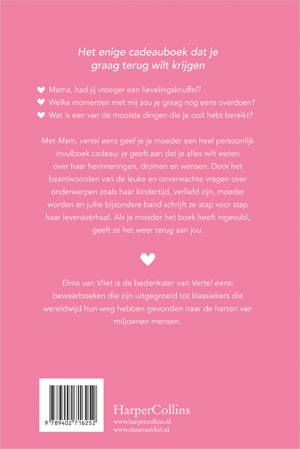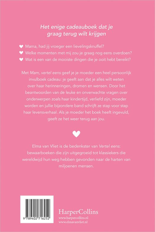 Mam, vertel eens is een compleet vernieuwd en herzien invulboek in de Vertel eens-serie van Elma van Vliet.