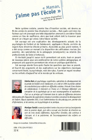 Notre système scolaire, premier lieu d'insertion sociale, est devenu au fil des années le premier lieu d'exclusion sociale... Mais quels sont donc les facteurs qui ont provoqué une telle dégradation amenant à considérer l'école comme un lieu de souffrance ? Cet ouvrage est une explication des développements actuels de la psychologie de l'enfant et de l'adolescent, appliquée à l'école, enrichie du regard d'une directrice d'école primaire.