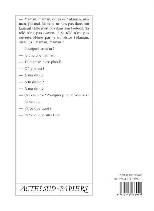 - Maman, maman, où tu es? Maman, maman, j'ai mal. Maman, tu n'es pas dans ton fauteuil? Elle n'est pas dasn son fauteuil. Ta télé n'est pas ouverte? Sa télé n'est pas ouverte. Même pas le transistor? Maman, où tu es? Maman, maman?