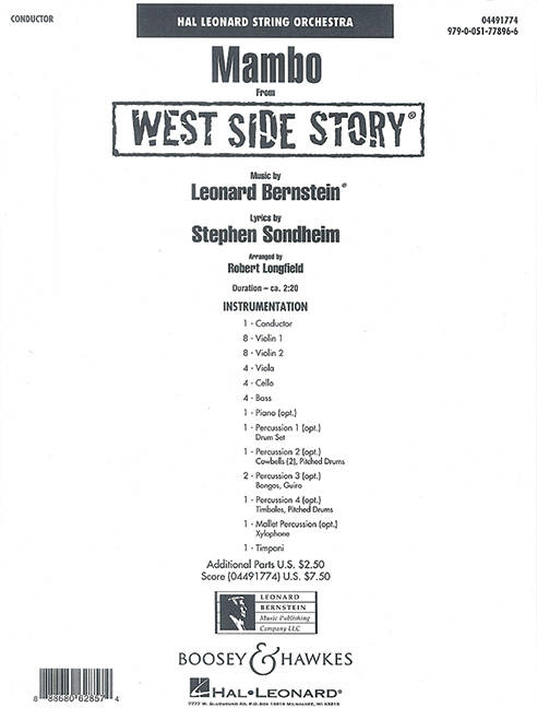 From one of the greatest musicals of all time, here is Bernstein's ever-popular Mambo in a new edition for strings. Capturing the authenticity and energy, Robert's adaptation results in a stunning showcase for concert or festival, or even an encore. Instrumentation: String orchestra, percussion and piano