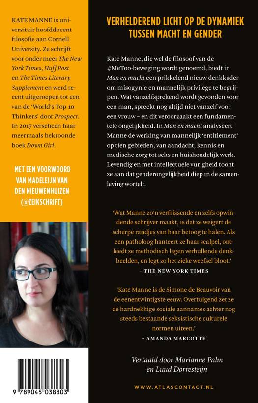'Man & macht' is het nieuwste werk van Kate Manne, die wel de filosoof van de #MeToobeweging wordt genoemd. Zij biedt in 'Man & macht' een prikkelend nieuw denkkader om misogynie en mannelijk privilege te begrijpen. Wat vanzelfsprekend wordt gevonden voor een man, spreekt nog altijd niet vanzelf voor een vrouw – en dit veroorzaakt een fundamentele ongelijkheid. In 'Man en macht' analyseert Manne de werking van mannelijk 'entitlement' op tien gebieden, van aandacht, kennis en medische zorg tot seks en huishoudelijk werk. Levendig en met intellectuele vurigheid toont ze aan dat genderongelijkheid niet door een paar slechteriken veroorzaakt wordt, maar diep in de samenleving wortelt.