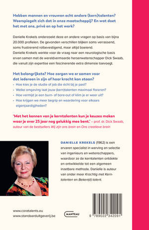 Hebben mannen en vrouwen echt andere (kern)talenten?Weerspiegelt zich dat in onze maatschappij? En wat doet het met ons, privé en op het werk? Danielle Krekels onderzoekt deze en andere vragen op basis van bijna 20.000 profielen. De gevonden verschillen blijken soms verrassend, soms frustrerend rolbevestigend, maar altijd boeiend.Danielle Krekels werkte voor de vraag naar een neurologische basis ervan samen met de wereldvermaarde hersenwetenschapper Dick Swaab, die vanuit zijn expertise een fascinerende extra dimensie toevoegt. Het belangrijkste? Hoe zorgen we er samen voor dat iedereen in zijn of haar kracht kan staan?- Hoe kies je de studie of job die écht bij je past?- Welke omgeving laat jouw (kern)talenten maximaal floreren?- Hoe vermijd je een burn- of bore-out of klim je er weer uit?- Hoe krijgen we meer begrip en waardering voor elkaars eigen(aardig)heden?