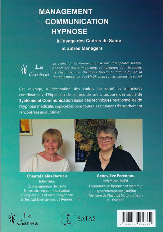 Cet ouvrage, à destination des cadres de santé et infirmières coordinatrices d'Ehpad ou de centres de soins, propose des outils de Systémie et Communication issus des techniques relationnelles de l'hypnose médicale, applicables dans toutes les situations d'encadrement rencontrées au quotidien. Chantal Galès-Darrieu est infirmière, Cadre supérieur de Santé, Formatrice en communication thérapeutique et en autohypnose à l'Institut Émergences de Rennes. Geneviève Perennou est Infirmière, MsEd, Formatrice en hypnose et systémie, Hypnothérapeute (Dublin), Membre de l'Institut Milton Erickson du Québec.