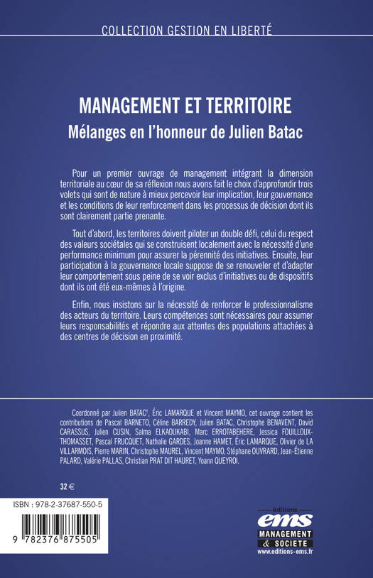 Pour un premier ouvrage de management intégrant la dimension territoriale au coeur de sa réflexion nous avons fait le choix d'approfondir trois volets qui sont de nature à mieux percevoir leur implication, leur gouvernance et les conditions de leur renforcement dans les processus de décision dont ils sont clairement partie prenante.