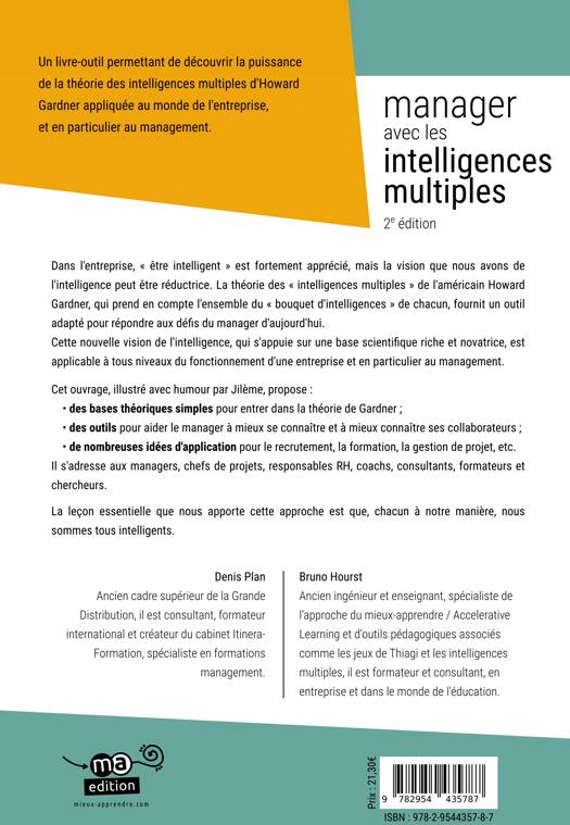 Dans l’entreprise, « être intelligent » est en général fortement apprécié, mais la vision que nous avons d’une personne « intelligente » peut restreindre considérablement le bénéfice que nous pouvons en tirer. La théorie des « intelligences multiples » de l’Américain Howard Gardner est en train d’entrer dans l’entreprise : en prenant en compte l’ensemble du « bouquet d’intelligences » des employés autant que des managers, cette approche fournit un outil particulièrement pratique pour répondre aux besoins et aux défis du manager d’aujourd’hui. Cet ouvrage, illustré avec humour par Jilème : • Donne quelques bases théoriques simples pour bien entrer dans la théorie de Howard Gardner. • Propose des outils pour aider le manager à mieux se connaître, mieux connaître ses collaborateurs et les personnes qui travaillent avec lui. • Développe de nombreuses idées pratiques d’application, en particulier pour le recrutement, la formation et la gestion de projet. Bruno Hourst est spécialiste des intelligences multiples. Denis Plan est formateur international au management.