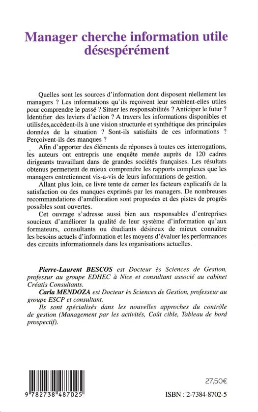 Quelles sont les sources d'information dont disposent réellement les managers ? Les informations qu'ils reçoivent leur semblent-elles utiles pour comprendre le passé ? Situer les responsabilités ? Anticiper le futur ? Identifier des leviers d'action ? A travers les informations disponibles et utilisées, accèdent-ils à une vision structurée et synthétique des principales données de la situation ? Sont-ils satisfaits de ces informations ? Perçoivent-ils des manques ? Ce livre tente de cerner les facteurs explicatifs de la satisfaction ou des manques exprimés par les managers.