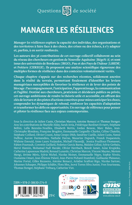 Les auteurs des 36 contributions de cet ouvrage collectif collaborent au sein du réseau des chercheurs en gestion de Nouvelle-Aquitaine (RégeN-A) et sont issus des universités de Bordeaux (IRGO), Pau et des Pays de l’Adour (LiREM) et Poitiers (CEREGE). Ils proposent une analyse scientifique rigoureuse des multiples formes de résilience dans des contextes volontairement variés.