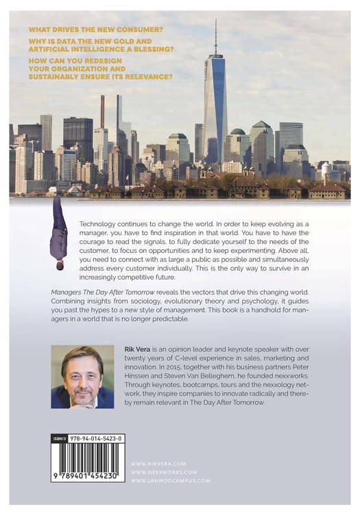 WHAT DRIVES THE NEW CONSUMER? WHY IS DATA THE NEW GOLD AND ARTIFICIAL INTELLIGENCE A BLESSING? HOW CAN YOU REDESIGN YOUR ORGANIZATION AND SUSTAINABLY ENSURE ITS RELEVANCE? Technology continues to change the world. In order to keep evolving as a manager, you have to find inspiration in that world. You have to have the courage to read the signals, to fully dedicate yourself to the needs of the customer, to focus on opportunities and to keep experimenting. Above all, you need to connect with as large a public as possible and simultaneously address every customer individually. This is the only way to survive in an increasingly competitive future. Managers The Day After Tomorrow reveals the vectors that drive this changing world. Combining insights from sociology, evolutionary theory and psychology, it guides you past the hypes to a new style of management. This book is a handhold for managers in a world that is no longer predictable.