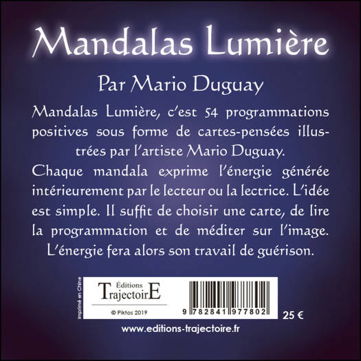 ''Mandalas Lumière'', c'est 54 programmations positives sous forme de cartes-pensées illustrées par l'artiste Mario Duguay. Chaque mandala exprime l'énergie générée intérieurement par le lecteur ou la lectrice. L'idée est simple. Il suffit de choisir une carte, de lire la programmation et de méditer sur l'image. L'énergie fera alors son travail de guérison.