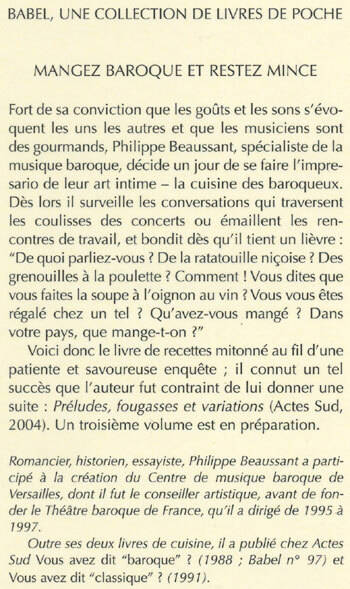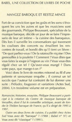 Le spécialiste de la musique baroque qu'est Philippe Beaussant a demandé à ses amis musiciens (William Christie, Jordi Savall, Jean- Paul Malgoire, etc. ) de lui confier leurs plus savoureuses recettes d'après-concert... "Il doit y avoir une connivence secrète entre l'oreille et le palais. La preuve est que les musiciens sont des gourmands. Et comme ils sont artistes, ils ne se contentent pas de manger ou même de bien manger : ils font la cuisine. Ceux que je connais jouent principalement la musique baroque, qui est particulièrement raffinée comme on sait, et demande du doigté, du jugement, de la délicatesse et de l'invention. Ils parlent entre eux de cuisine et de sonates, et se réunissent pour déguster. Voulez-vous connaître le secret de la véritable ratatouille niçoise telle que la faisait le grand-père de Jean-Claude Malgoire ? Les recettes catalanes de Jordi Savall ? L'époustouflant sardi a beccafieu de Fabio Biondi ? L'authentique bortsch ukrainien et les vareniki de Galina Zinchenko ? Les secrets de Marie Leonhardt, de Reinhard Goebel ou le Persimmon Pudding d'Alan Curtis ? Ouvrez le livre, tout y est. Mais manger n'est qu'une part du plaisir. Il n'y a pas de bon repas sans amitié. Ce livre est aussi un tour de table convivial : je l'ai écrit pour que chacun, en se régalant, ait le souvenir d'autres régals, ceux de l'oreille, qui nous ont été dispensés par les mêmes artistes ; et qu'ils répandent ainsi, avec leur plaisir, tous les fumets de l'amitié et de la musique - de bouche à oreille, en quelque sorte." Philippe Beaussant