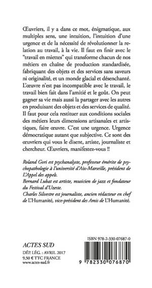 Le désir de retour à l'oeuvre sonne à toutes les portes de la vie : la vie de l'humain qu'on soigne, qu'on éduque, à qui on rend justice, qui s'informe, qui se cultive, qui joue, qui s'associe, qui se bat, fort de la solidarité qui s'offre à qui sait la chercher. Ce manifeste revendique la place de l'homme au centre des activités de production et création, pour lutter contre la normalisation technocratique et financière.