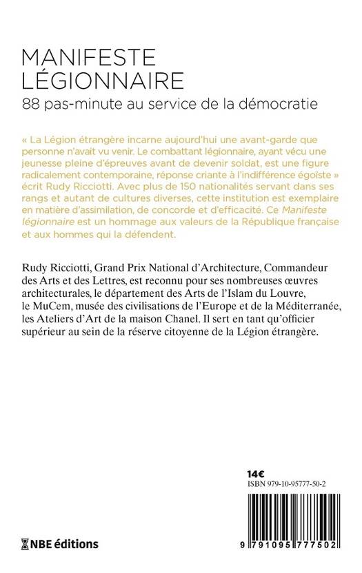 « La Légion étrangère incarne aujourd'hui une avant-garde que personne n'avait vu venir. Le combattant légionnaire, ayant souvent vécu une jeunesse d'humilité avant de devenir soldat, est une figure radicalement contemporaine, réponse criante à l'indifférence égoïste » écrit Rudy Ricciotti. Avec plus de 150 nationalités servant dans ses rangs, et autant de cultures diverses, cette institution est exemplaire en matière d'assimilation, de concorde et d'efficacité. Ce Manifeste légionnaire est un hommage aux valeurs de la République française et aux hommes qui la défendent. Il est préfacé par le général Alain Lardet, commandant la Légion étrangère.
