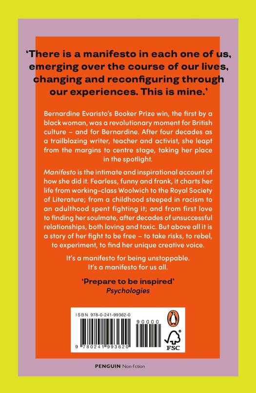 MANIFESTO is Bernardine Evaristo's intimate and inspirational, no-holds-barred account of how she did it, refusing to let any barriers stand in her way. She charts her creative rebellion against the mainstream and her life-long commitment to the imaginative exploration of 'untold' stories. And drawing deeply on her own experiences, she offers a vital contribution to current conversations around social issues such as race, class, feminism, sexuality and aging.