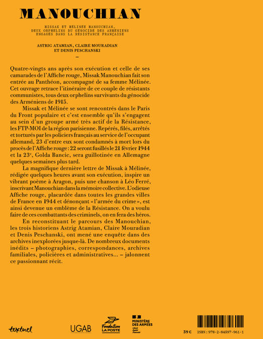 Missak et Mélinée Manouchian, deux étrangers, arméniens et communistes, entrent au Panthéon début 2024. La valeur symbolique de cet événement est majeure. Cet ouvrage reconstitue l'histoire de ces deux orphelins du génocide des Arméniens devenus héros de la Résistance française. Ce parcours documentaire nourri d'archives dont de nombreux inédits est le fruit d'une exceptionnelle investigation. Photographies, documents familiaux, archives administratives, coupures de presse et correspondances jalonnent les textes des trois historiens signataires du livre.