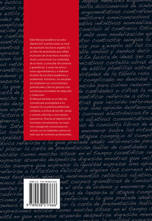Este Manual ayudará a los estudiantes de español como lengua extranjera a perfeccionar su nivel de expresión escrita en español. Es un libro de aprendizaje que refleja el proceso de la escritura: enseña a reunir ideas, a conocer las convenciones de los géneros académicos y profesionales, a consultar diccionarios y gramáticas, a variar las estructuras argumentativas en un texto y a elaborar el estilo de escritura. Asimismo, los estudiantes ampliarán considerablemente sus conocimientos gramaticales y léxicos gracias a las numerosas actividades de redacción y traducción. El Manual también es un libro de consulta que acompañará a los usuarios en su práctica profesional cotidiana, a la hora de escribir cartas y correos, informes u otros textos expositivos. Gracias al repertorio de funciones comunicativas, los usuarios conseguirán comunicarse sin errores con los hablantes nativos en todo tipo de contextos profesionales.