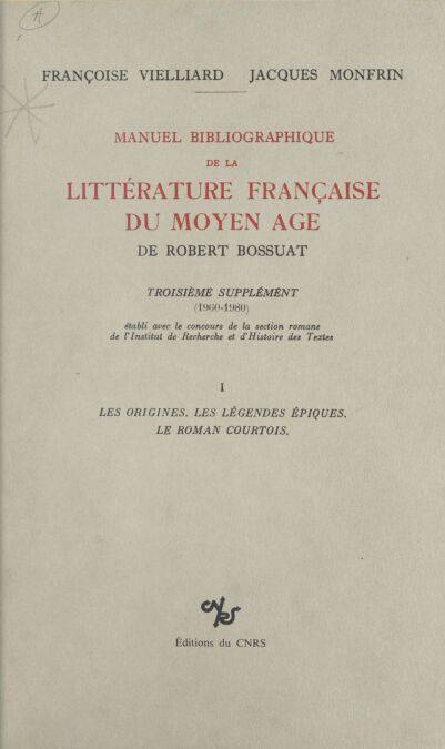Le « Manuel bibliographique de la littérature française du Moyen Âge », publié par Robert Bossuat en 1951, présentait l'essentiel de la production scientifique, depuis les origines de la discipline jusqu'en 1949. Il a été mis à jour par deux suppléments, en 1955 - pour les années 1949-1953 (avec la collaboration de Jacques Monfrin) - et en 1961 pour les années 1954-1959. Le troisième supplément, organisé suivant le même plan, couvre la période 1960-1980. L'abondance des titres analysés (livres et articles) a amené à le diviser en deux volumes, avec pagination continue. On trouvera, dans le premier, les généralités (la liste des ouvrages de référence a été tenue à jour jusqu'en 1984), et les chapitres I (Les plus anciens textes), Il (Les légendes épiques), et III (Le roman courtois) de la première partie, L'ancien français. Le second volume, qui suivra immédiatement, contiendra la fin de la première partie et la seconde, Le moyen français, ainsi que les tables. Ces tables reprendront également celles qui terminent le Manuel et ses deux premiers Suppléments, pour permettre une consultation rapide de l'ensemble.