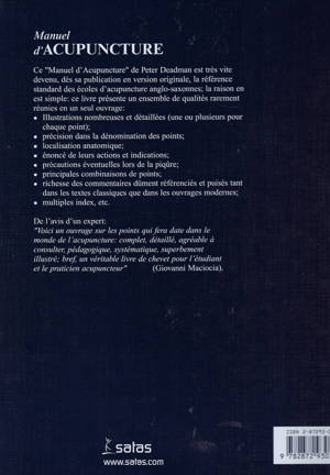 Ce "Manuel d'Acupuncture" de Peter Deadman est très vite devenu, dès sa publication en version originale, la référence standard des écoles d'acupuncture anglo-saxonnes, la raison en est simple : ce livre présente un ensemble de qualités rarement réunies en un seul ouvrage : Illustrations nombreuses et détaillées (une ou plusieurs pour chaque point) ; précision dans la dénomination des points ; localisation anatomique, énoncé de leurs actions et indications ; précautions éventuelles lors de la piqûre ; principales combinaisons de points ; richesse des commentaires dûment référencés et puisés tant dans les textes classiques que dans les ouvrages modernes ; multiples index, etc. De l'avis d'un expert : "Voici un ouvrage sur les points qui fera date dans le monde de l'acupuncture : complet, détaillé, agréable à consulter, pédagogique, systématique, superbement illustré ; bref, un véritable livre de chevet pour l'étudiant et le praticien acupuncteur" (Giovanni Maciocia).